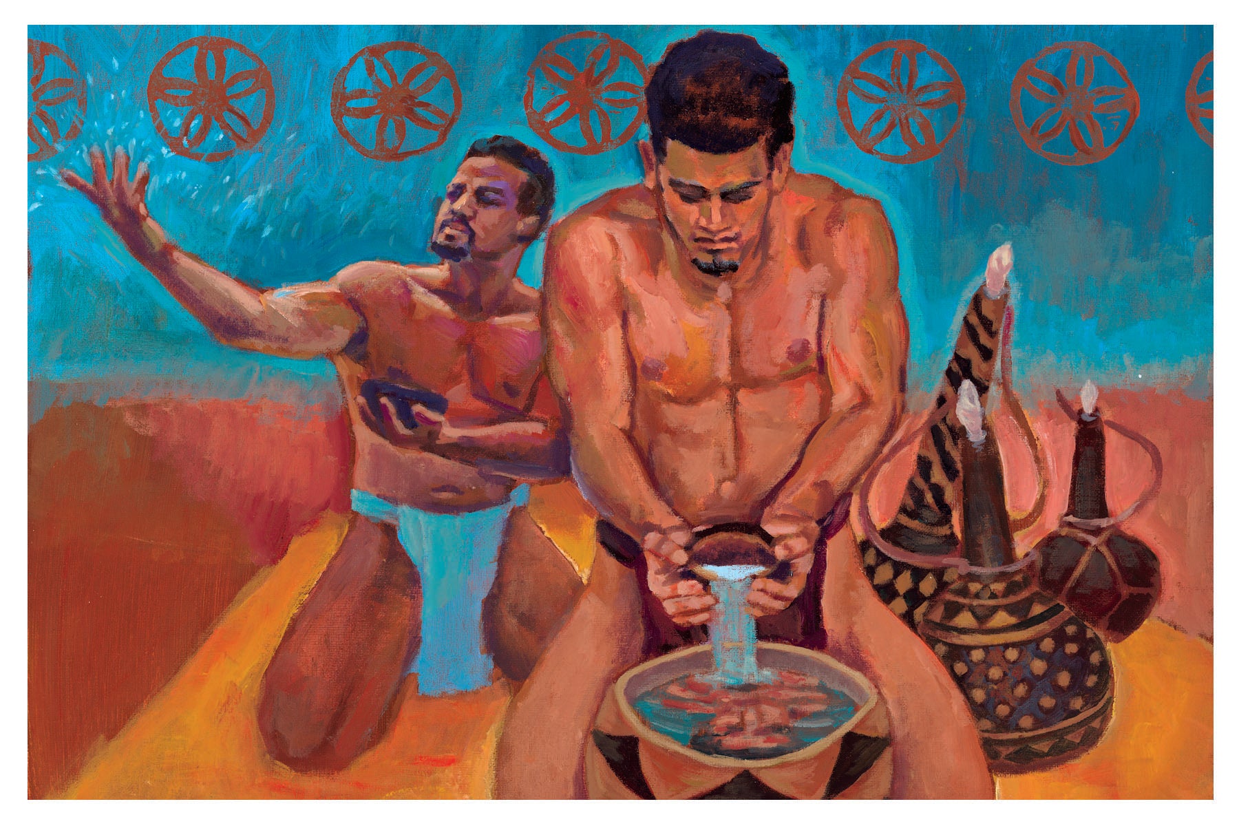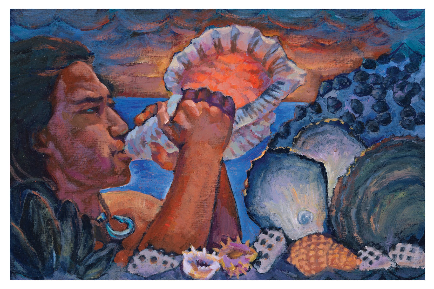Although not present in the text of the first wā of Kumulipo, human figures are depicted with examples of plant life in some illustrations to further reinforce humanity's dependence on the natural world around us. Being that some of the plant life mentioned no longer exists in our world today, the artist, Doug Poʻoloa Tolentino, and his ‘ohana facilitated research available via their own personal genealogy to bring to life those plants that are no longer with us.