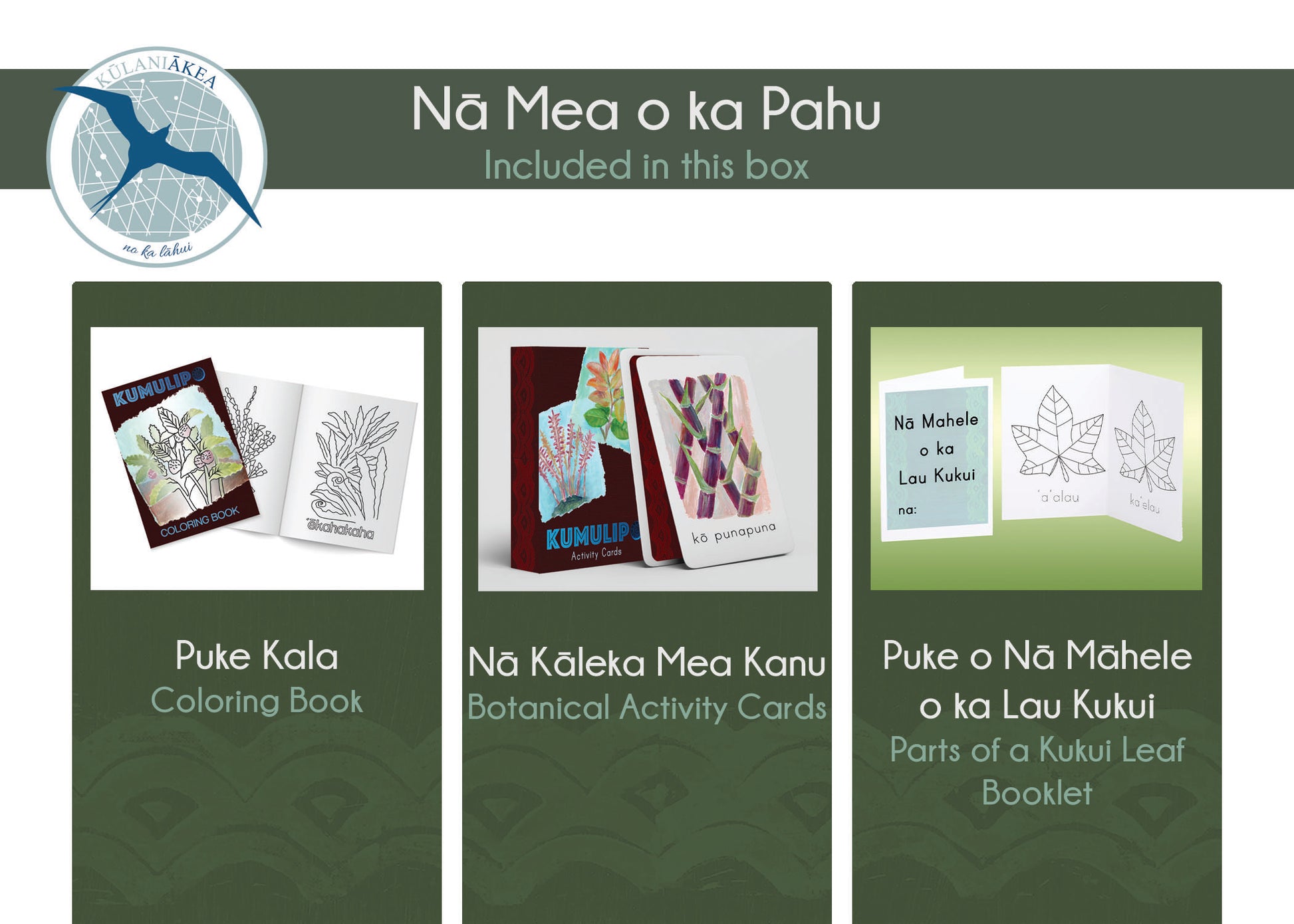 This pahu waiwai (resource box) includes materials curated by the kumu (teacher) of Kūlaniākea to perpetuate ʻike kūpuna (ancestral knowledge) starting with our kūpuna (ancestor) in training, our keiki (child, offspring, descendent).