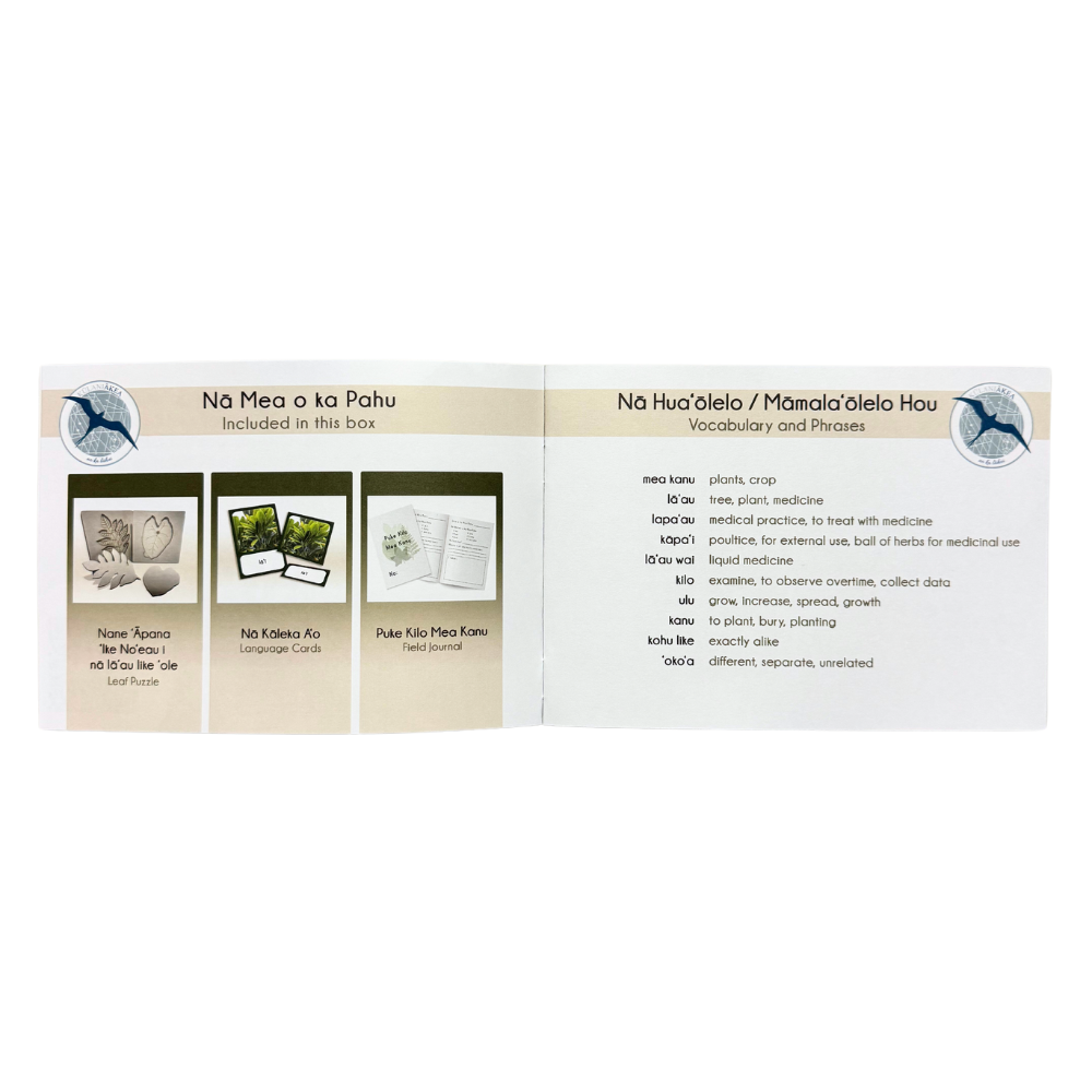 With this kit keiki and makua will be introduced to various medicinal plants found throughout Hawaiʻi. The three-part cards teach memorization through familiarization of name and image. Apply your learnings with the field journal booklet and share your findings. Customize your puzzles with paint, crayons, or marker!